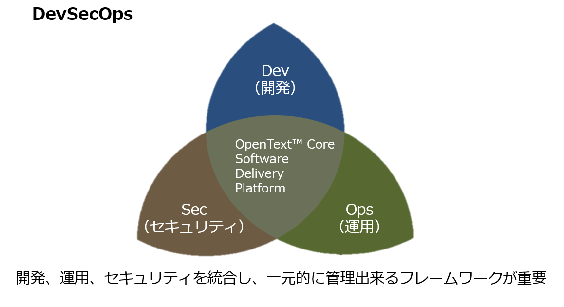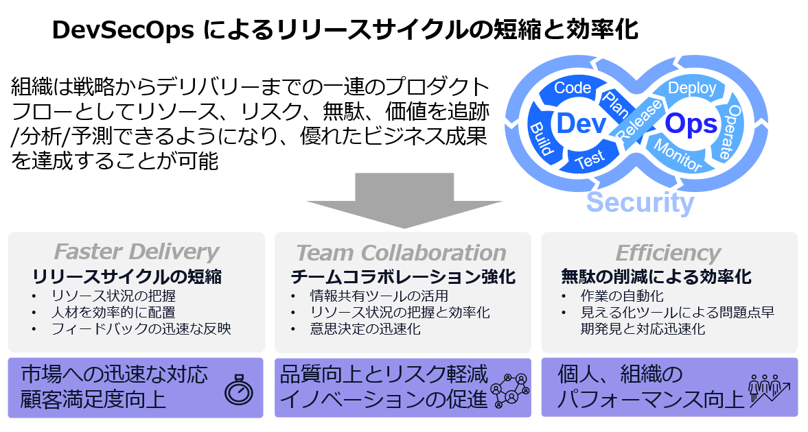 OpenTextの推進するDevSecOpsでは「リリースサイクルの短縮」「チームコラボレーション」「無駄の削減による効率化」の3本柱による改善を提案しています。