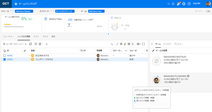 イテレーション単位のバックログのストーリーポイントでベロシティを調整するには、チームバックログ画面においてスプリントのチームとそのキャパシティを確認し、担当者アサインの可否判断やスプリントの見直しを行います。