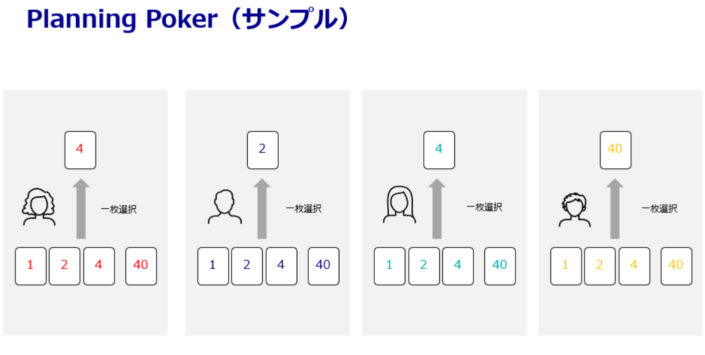 各自が数値を選んだら、全員の数字を見せ合ってそれぞれの数値の根拠を聞きながら調整を行い、全員の合意を得ることが出来る数字が出たら決定とします。