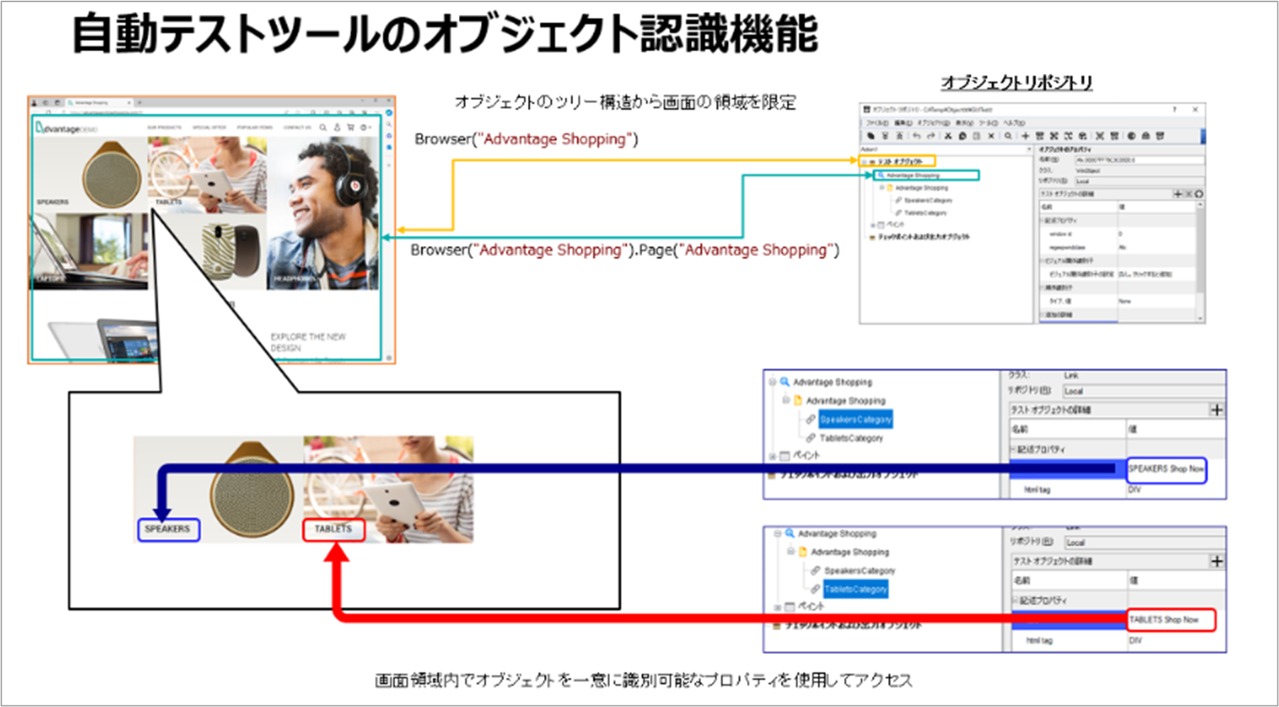 プロパティによるオブジェクト認識はオンプレミス版のUFTと同じ形式であり、画面上のオブジェクトに対してそのTextやNameなどのプロパティの値からテスト対象のオブジェクトを一意に識別することが可能です。