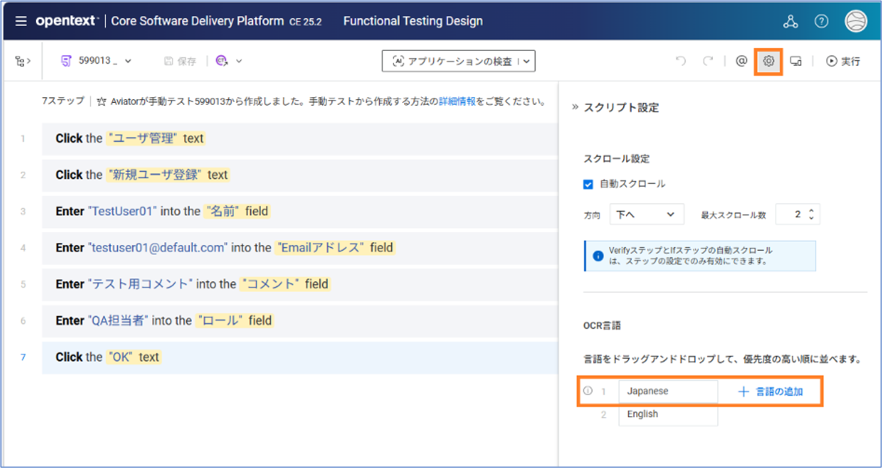 Codeless Test Designerではスクリプトの作成・編集に加え、オブジェクト認識方法の選択やOCR言語の設定、
