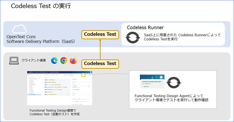 作成したCodeless TestはSaaSに用意されたCodeless Runnerによって継続的に実行可能であり、ローカルのテスト環境を必要としない効率的なテストの運用を可能とします。