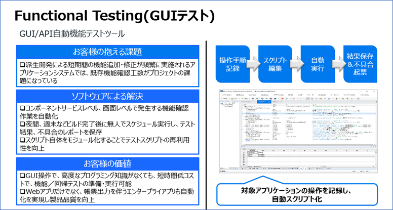 Functional Testingはマウスやキーボード、タッチ操作などを記録・再生することでアプリケーションのテストを効率化、省力化することが可能な自動テストツールです。