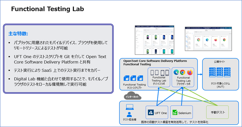 OpenText™ Software Delivery PlatformはSaaS上にモバイルおよびブラウザのテスト環境を用意しており、ユーザがリモート操作でテストを実行出来るようになっています。この機能とオンプレミスのOpenText™ Functional Testing(旧製品名:UFTOne)を組み合わせることで、既存のテストスクリプトも有効活用することが可能であり、またオンプレミスにテスト環境を準備する必要がないSaaS上の継続的なテスト実行の環境を用意することが可能となります。