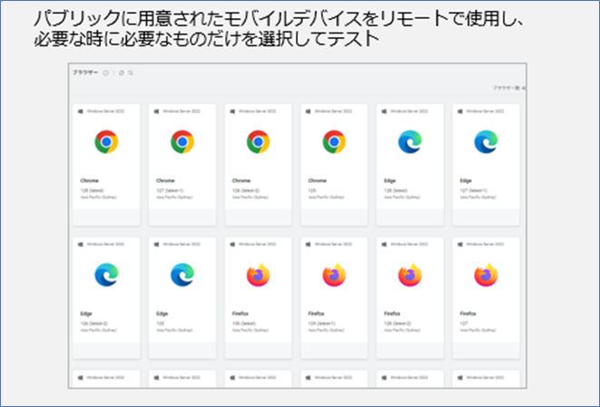 また、ブラウザテストではWindows ServerのVMが複数用意されておりChrome、Edge、FireFoxの複数のバージョンから選択してテストを実行することが出来ます。